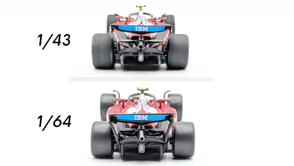 タイヤの表面加工の差ですぐにスケールがわかるリアエンド。しかしこのきめ細かいタイヤの表現もつい数年前に登場したばかりなので、両スケールとも進化が著しいですねぇ。